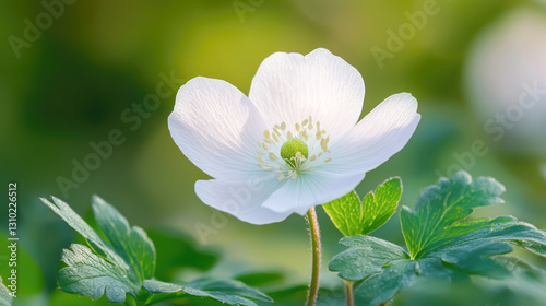 © romanets_v, Fototapeta premium White anemone flower blooming in sunlit garden with lush green foliage