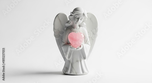 Fototapeta premium White Angel Statue Holding Glowing Pink Heart on White Background