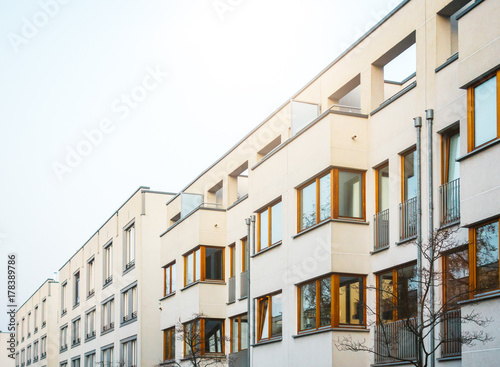 © Novanture, Naklejka premium white apartment buildings in a row with wooden windows