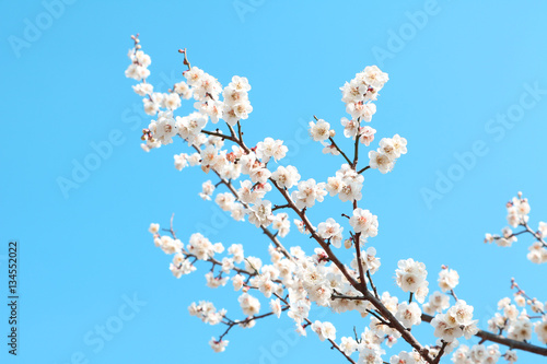 Fototapeta premium White apricot flowers with blue sky background