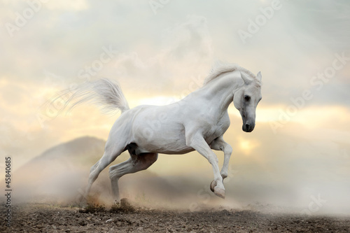 © Mari_art, Fototapeta premium white arab stallion in dust