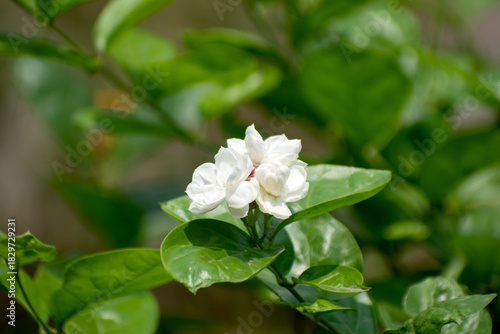 © Jahid, Obraz premium White arabian jasmine flower shining among green leaves.