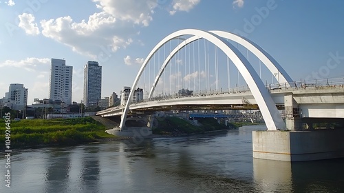 © Generative AI, Naklejka premium White Arch Bridge Over River with Modern City Skyline in Daylight : Generative AI