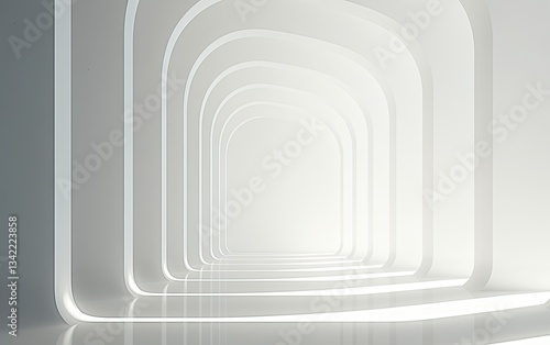 Naklejka premium White arched corridor, receding perspective, bright light, futuristic design,...