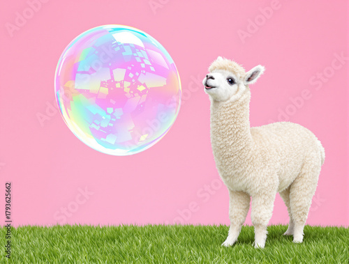 Fototapeta premium White baby alpaca looking curiously at a large, colorful bubble on a vibrant...