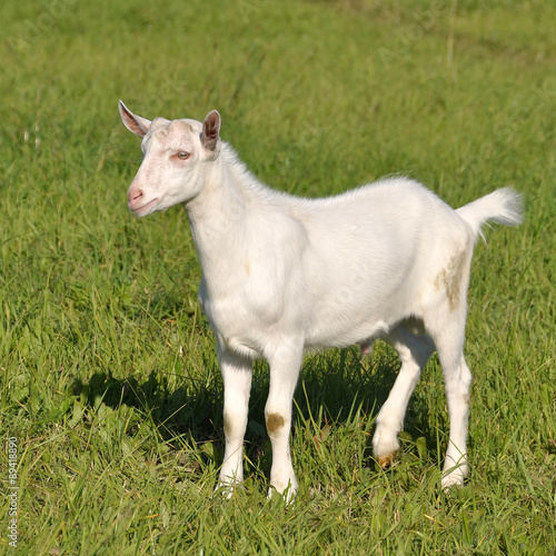 Fototapeta premium White baby goat in a green field on a farm