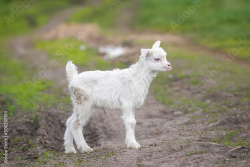 © alexbush, Obraz premium White baby goat on green grass in sunny day