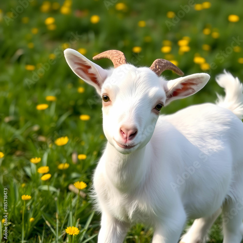 Fototapeta premium White baby goat standing on green grass with yellow flowers