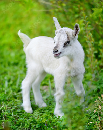 © nmelnychuk, Obraz premium White baby goat standing on green lawn