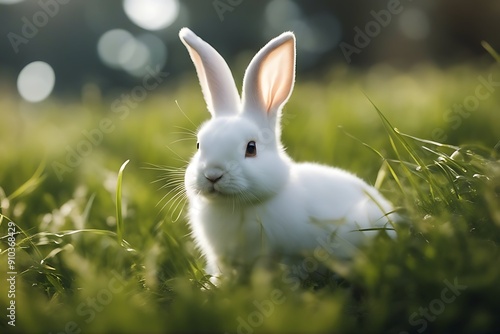 Obraz premium white baby rabbit grass animal nature cute easter mammal green pet small ear farm fur young meadow spring domestic furry rodent little hare background summer grey fluffy beautiful fauna playful
