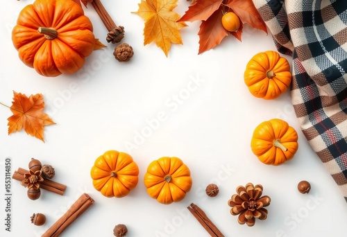 Fototapeta premium White backdrop, mini pumpkins, fall leaves, acorns, cinnamon sticks, wool, plaid, arrangement, plaid