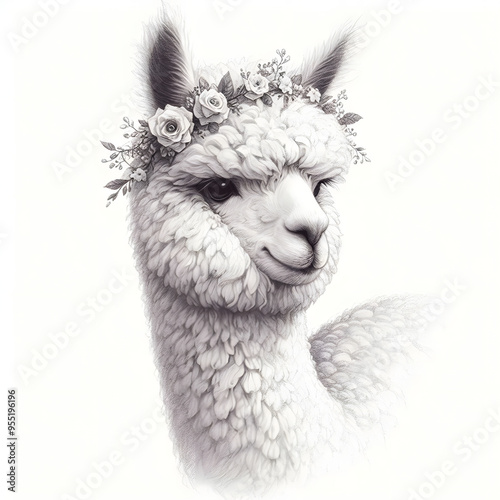 Fototapeta premium 흰 배경, 알파카, 펜슬 드로잉 (White background, alpaca, pencil drawing)