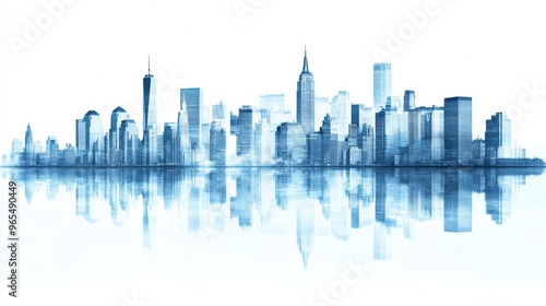 © wanna, Obraz premium White background, New York City skyline, blue and white color theme, transparent glass buildings,