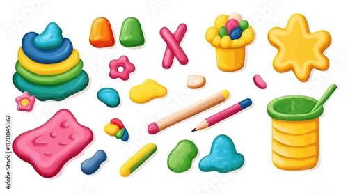 © Li, Naklejka premium White background schoolbook sticker set featuring modeling clay , designed for educational purposes with colorful, playful illustrations of shapes and figures.