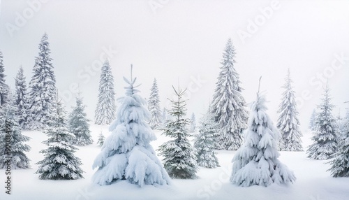 © Photo by mQ, Fototapeta premium White background with a hand-painted winter forest motif, featuring Christmas trees and snow, creating a serene and festive holiday scene