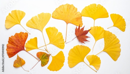 © Kati Lenart, Obraz premium White background with autumnal ginkgo biloba land maple leaves isolated.