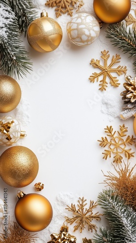 Fototapeta premium White background with gold Christmas decorations, including golden snowflakes and ornaments