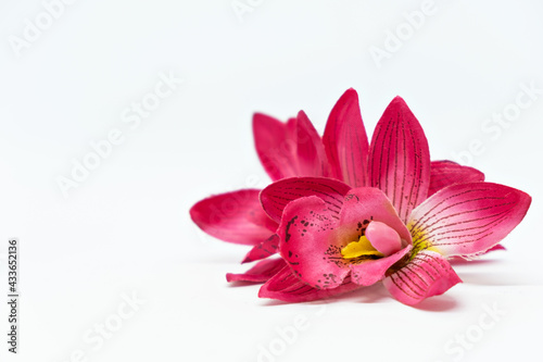 © olga_demina, Fototapeta premium white background with pink tropical flower orchid frangipani mock up spa concept
