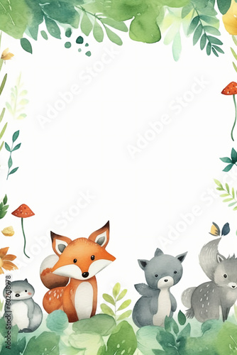 Naklejka premium White background with simple leaves in corner with cute forest animals watercolor style. AI generative
