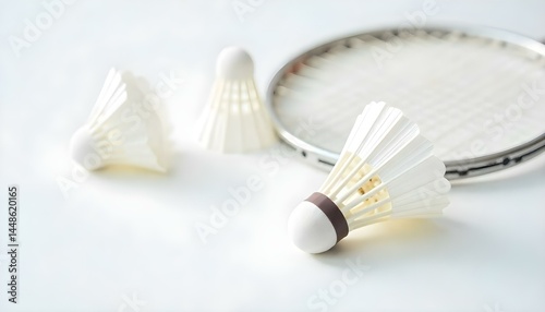 © Muzamilart, Fototapeta premium white badminton shuttlecocks scattered near racket on white background