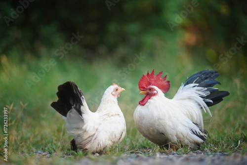 Fototapeta premium White Bantams,Rooster And Hen On Country Path, Cheerful Farmyard Scene With...