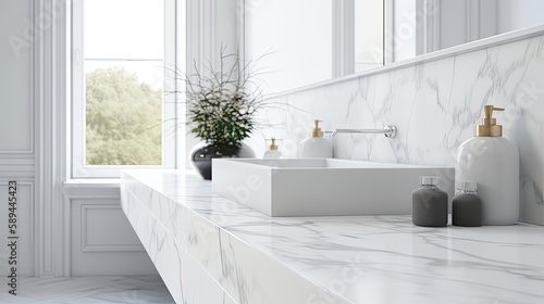 Naklejka premium White bathroom interior, empty marble table. Generative AI