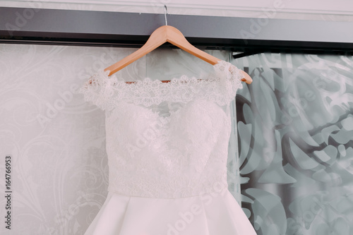 © stakhov, Naklejka premium White beautiful bridal dress with lace on a wooden shoulders, before wedding ceremony