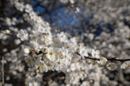 Fototapeta premium White beautiful plum blossoms on a twig.