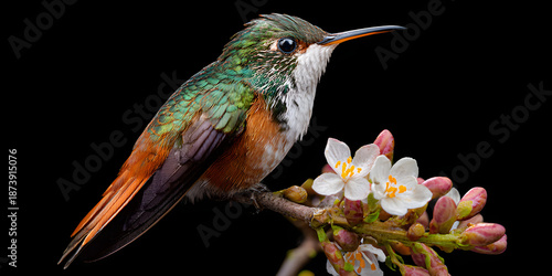 © Nikola, Fototapeta premium White bellied hummingbird feeding on red flower against dark background nature minimal