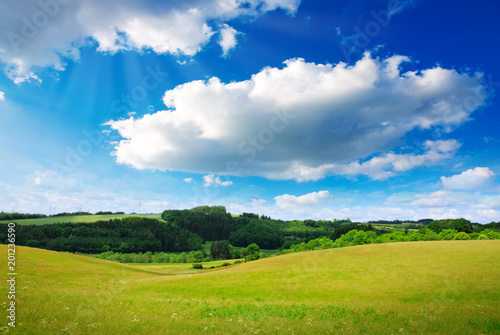 © Swetlana Wall, Fototapeta premium White big clouds and green field.