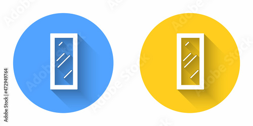 Fototapeta premium White Big full length mirror for bedroom, shops, backstage icon isolated with long shadow background. Circle button. Vector