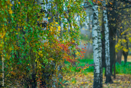 © Anatoliy, Obraz premium White birch in the park on an autumn November day.