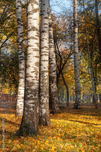 Obraz premium White birch trees with autumn bright yellow foliage with fallen leaves on the...