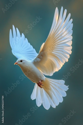 © olegganko, Obraz premium White bird in flight with spread wings against a clear blue sky during daylight