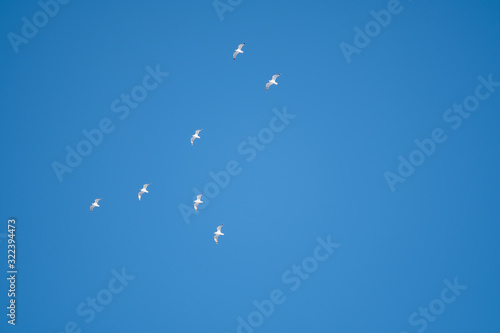 © Viktor, Fototapeta premium White birds on a background of blue sky. Seagulls in the coast. A clear, cloudless sky. Day, cold, sunny.