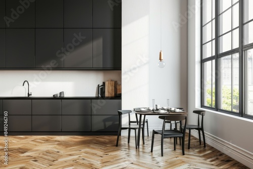 © Bundi, Fototapeta premium White blank wall, minimalist furniture, wooden elements, and a window in this modern kitchen design concept.