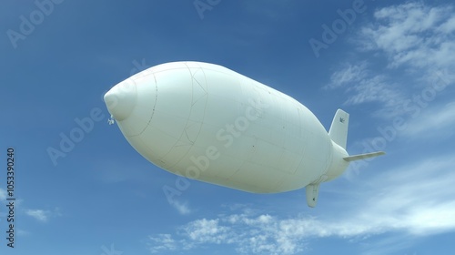 Obraz premium White blimp flying in a blue sky with white clouds.