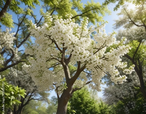 © Wachiraporn, Fototapeta premium White blooming aesculus tree with branches reaching upwards, upwards, blooming tree, botany
