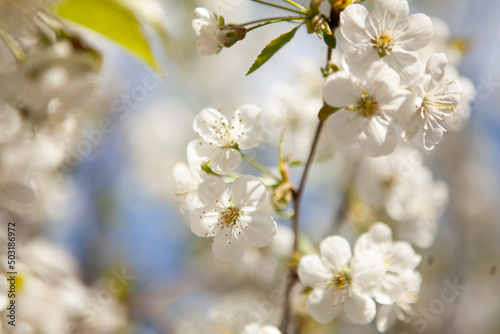 Obraz premium White blossom on a tree. Blooming cherry. Spring
