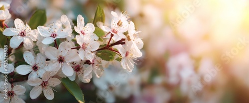 © Bob, Fototapeta premium White Blossom Tree Branch with Sunlit Background in Soft Focus