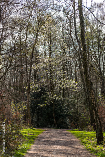 © Luca, Naklejka premium White blossomed tree in a forest setting with a path
