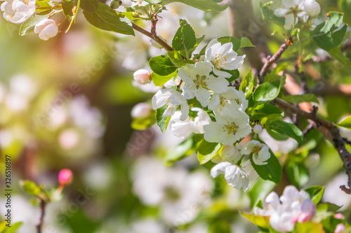 © Dmitrii Potashkin, Obraz premium White blossoming apple trees in the sunset light