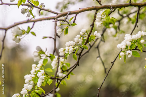 Fototapeta premium White blossoming apple trees with rain drops