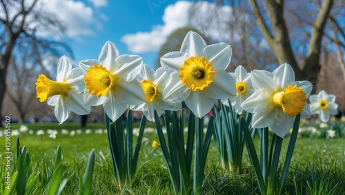 © -Quantum Pixels-, Fototapeta premium White blossoming daffodils in a park on a bright spring day