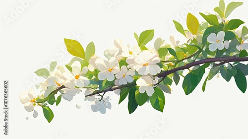 © Ariestia, Obraz premium White Blossoms and Green Leaves on a Branch Against a White Background