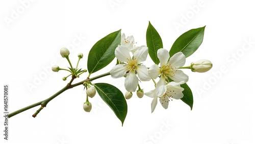 © The 2R Artificiality, Obraz premium White blossoms, buds, and leaves on a citrus tree branch with a clean white background