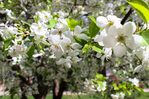 Obraz premium White blossoms on branches cherries in selective focus