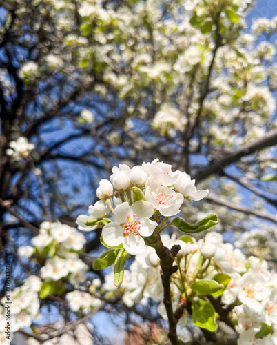 © Kufotos, Fototapeta premium White blossoms on tree branches in sunlight.