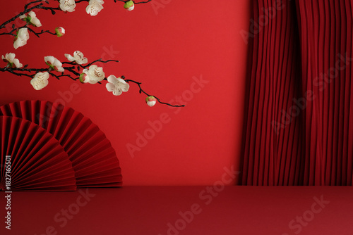 Obraz premium White blossoms over a red fan with deep red pleated curtains and red stage.