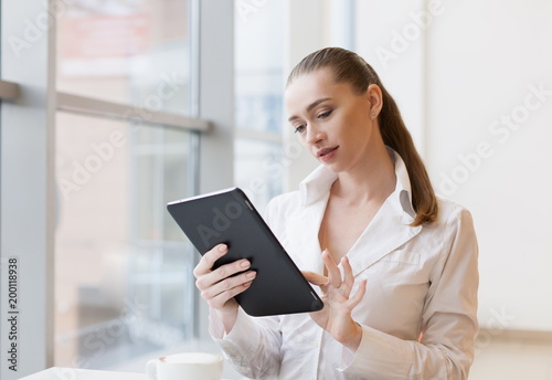 © erainbow, Fototapeta premium White blouse, tablet, serious